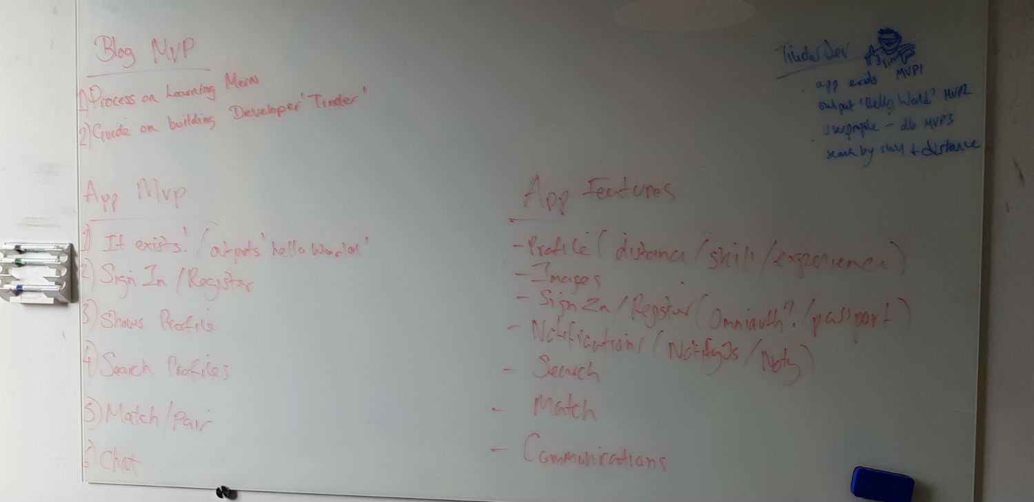 Grouped as pairs to run through tutorials to try and get a MERN stack hello world program working. Each pair had different tutorials and different levels of success. As energy waned in the day we decided to group together to get an environment set up to for our Dind'r app.